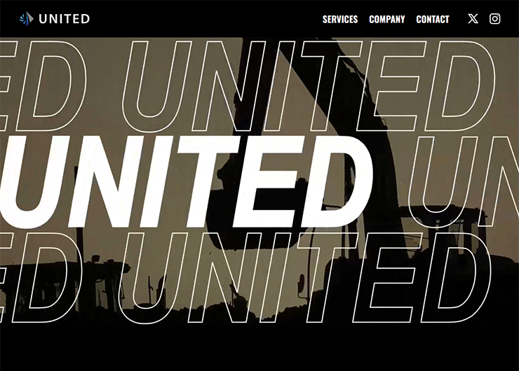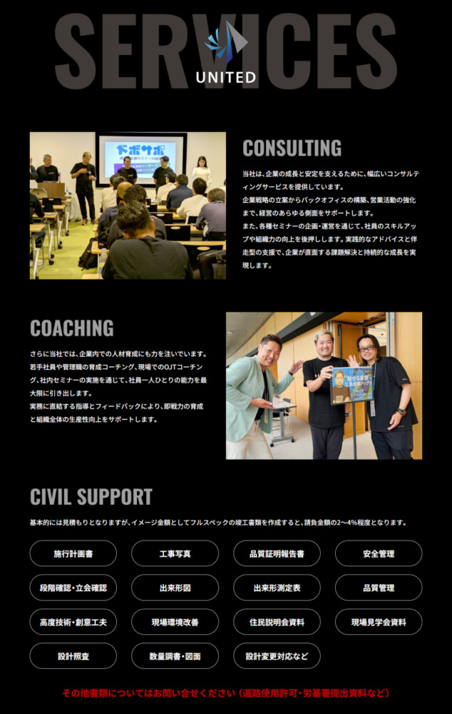 また、サイト全体のテキスト量を絞ることで、どのような現場・依頼にも柔軟に対応できるというユナイテッド様のスタンスを、短い言葉とビジュアルでストレートに伝えています。